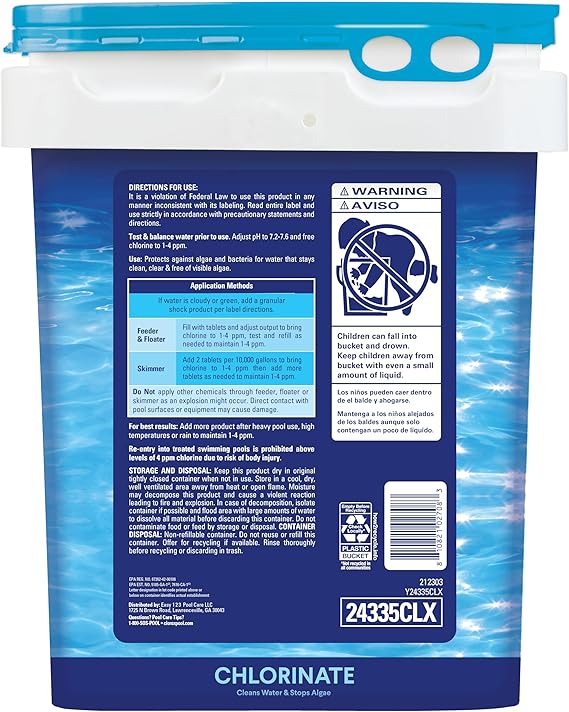 Clorox Pool&Spa XtraBlue Chlorinating Tablets go the extra mile to help maintain healthy pool water. These multi-functional tablets work hard to keep your water clear from both bacteria and unsightly algae. Each tablet dissolves slowly and contains stabilizer for a long lasting clean. The XtraBlue Formula protects your surfaces from scale and corrosion, and includes conditioners that make your water feel silky smooth. Maintaining 1-4 ppm* of Free Chlorine is critical to keeping water clean and suitable for swimming. Use weekly in skimmers, feeders or floaters. Always apply chemicals per label directions. Circulating pool water when applying chemicals helps disperse chemicals throughout the pool for maximum coverage.